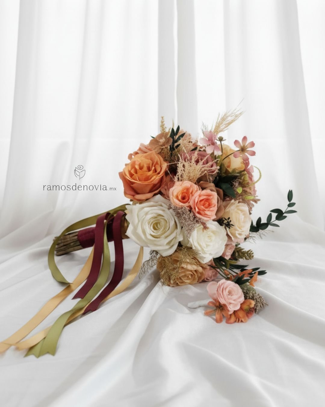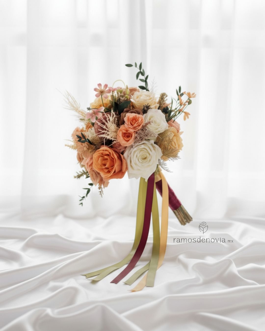 Un bouquet cálido y encantador con rosas en tonos durazno, ivory y rosa pastel. Su combinación de colores suaves y naturales transmite una sensación de armonía y elegancia, ideal para bodas al aire libre o temáticas boho.