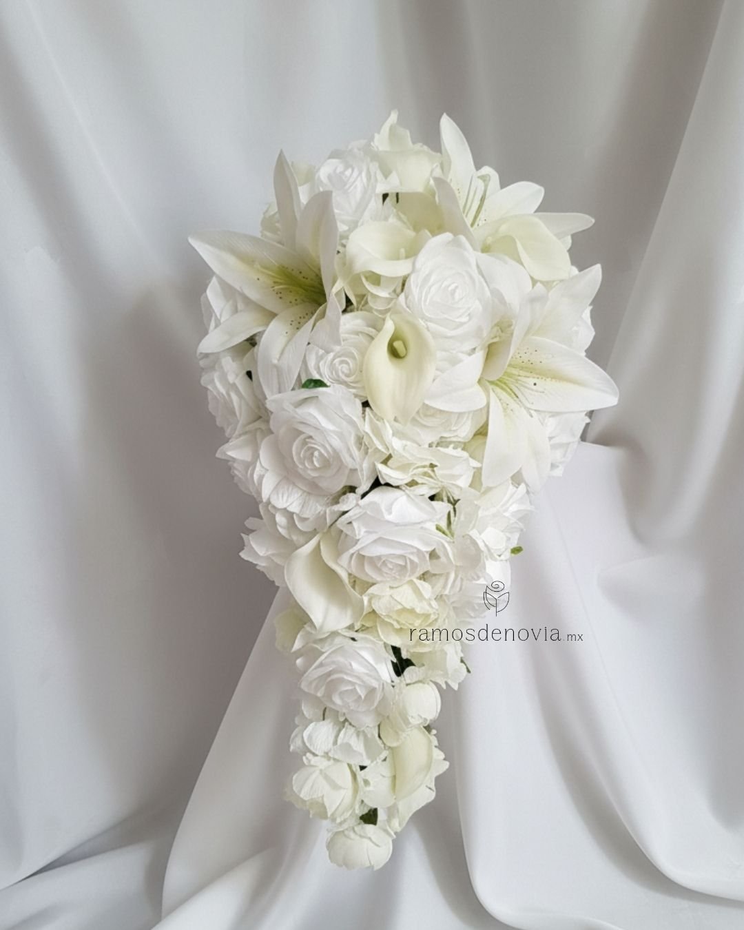 Ramo en cascada totalmente blanco con rosas, calas y lilys.