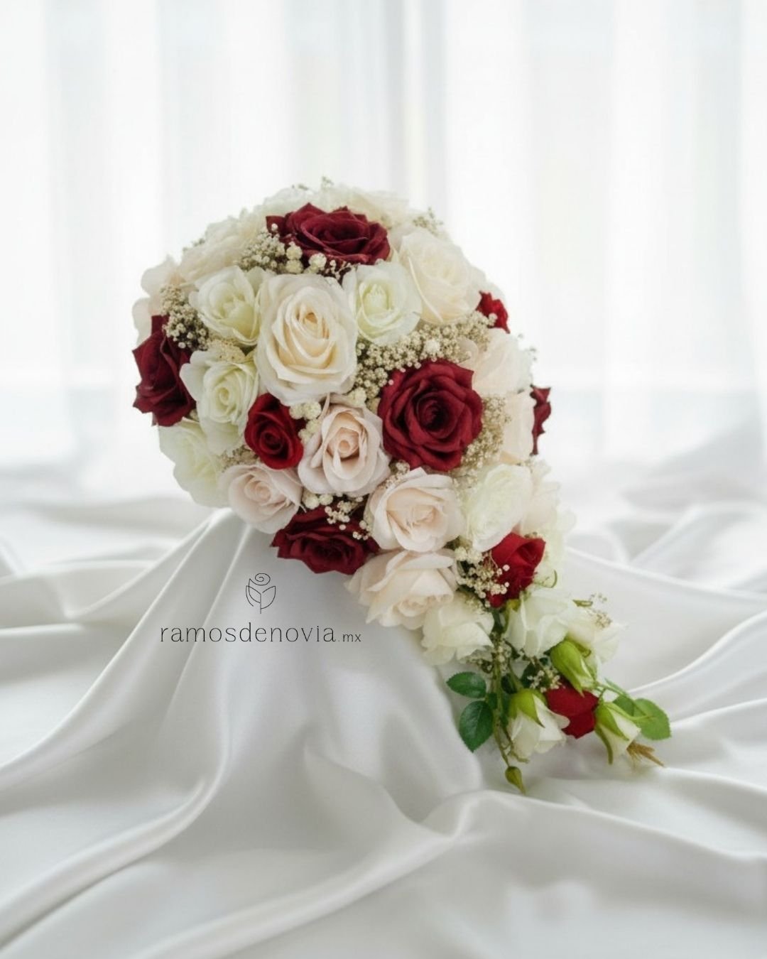 Una combinación apasionada de rosas vino y ivory que descienden en cascada con un aire majestuoso y clásico. Perfecto para reflejar amor y elegancia en cada detalle.