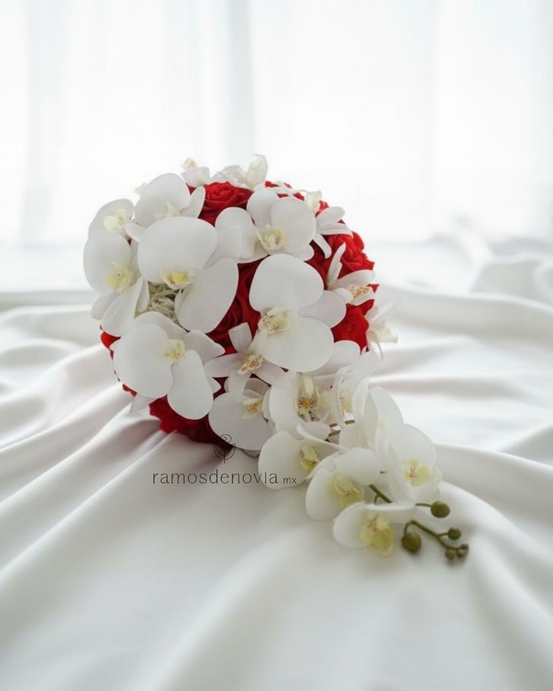 Un ramo en cascada de gran dramatismo con rosas rojas intensas y orquídeas phalaenopsis blancas, símbolo de amor eterno y pureza. Ideal para novias que desean un ramo inolvidable.