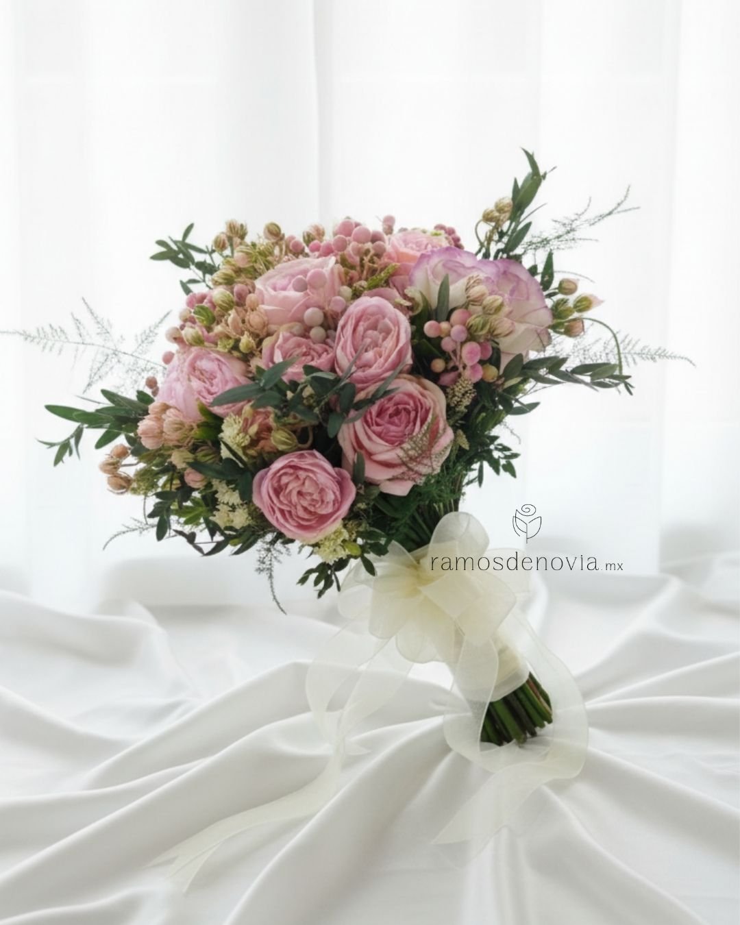 Bouquet luminoso en tonos rosa e ivory, romántico y delicado.