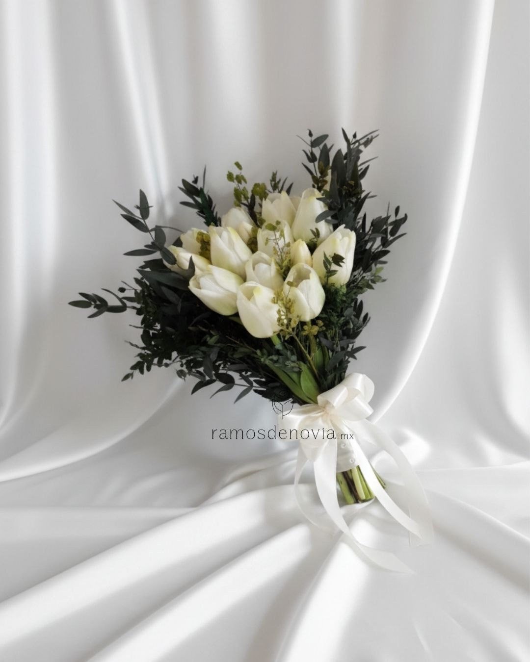 Un ramo sencillo y sofisticado con tulipanes en tono ivory. Su estilo minimalista lo convierte en el complemento perfecto para novias que buscan elegancia natural y discreta en su día especial.